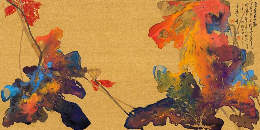 本次展览展出的金笺泼彩荷花系列作品,以势造境、荷叶为面,连茎为线,红荷为点,西方美学的点、线、面运用与宋画有无之间的诗境传达交融独具一格。