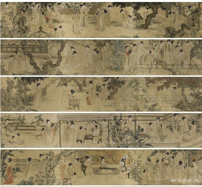 上海博物馆的《仕女图》长卷,笔法简洁,意境却格外生动。它描绘了明代宫廷女子的生活、游戏的场景。整幅长卷共分为六个部分,每一部分都是一个单独场景。包括:捣丸、蹴鞠、戏婴、画像、梳妆、弹乐六组,以树石楼阁加以分割,作品同样对人物的动作、体态、神情进行精心的描绘,甚至连庭院杆栏的用笔也十分精细。《仕女图》全卷人物众多,场面宏大,共描绘了一百多位女性,她们艳丽的服饰,姣好的面容,体现了宫廷女性的优雅与富贵。女性面部画的三白妆,以及她们的服装款式,都是典型的明代风格。