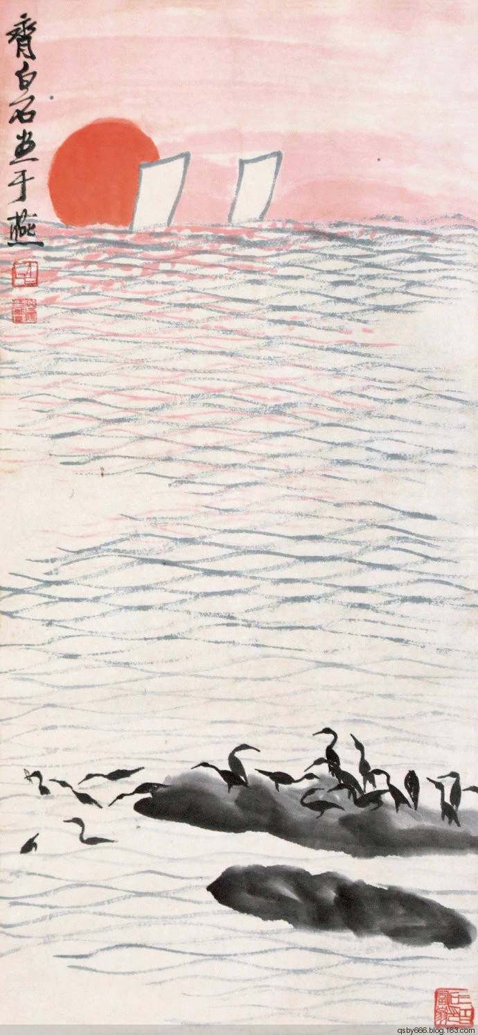 齐白石的山水画,构图出奇出新,无常法而又合法,貌似平淡的笔调,大气磅礴、纯净明丽。在似与不似之间,把山水灵性的本质,或轻或重、或明或暗地表现出来,大开大合中又见细腻、朴素的善良与乐观的坚强。在白石老人的山水画中,每一笔似乎都含着家乡的泥土气息,每一根线条似乎都凝结着大自然的露珠,清新而华滋、深厚而通俗。有评论家指出,齐白石的“花鸟虫鱼非常突出地表现了他继承传统而又发扬了传统的特色,但是他的山水人物则是突破时代的创作”。