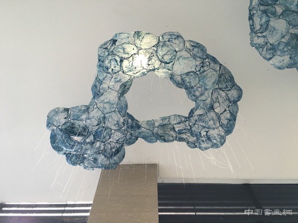 美籍华裔艺术家刘北立从女娲补天的传说中汲取灵感,他在美术馆的天花板上悬挂朵朵蓝色的云,千针万线从期间荡下来。参观者抬头越过作品便能看到天光,而女性的日常劳作,包含了纺织与修补,也蕴含着治愈的力量。