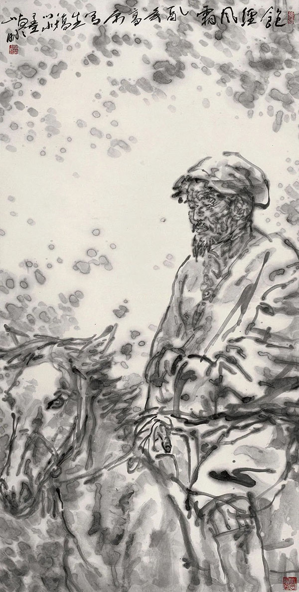回杭后,我沿着这种思路并融合对传统笔墨的理解与以往实践成果画了大量的习作,以深化与拓展对宿墨的研究。还以草原阳光下面的那幅速写作素材,以纯宿墨线条作主要语言,画成了一幅以“阳光”为题的创作。并以此为契机继续用宿墨法,选择水墨速写中反映草原最普通牧民的平凡生活为题,创作了一套以“待客”、“初雪”、“轮回”、“草原无垠”为主体的,以最常见生活为题材,却可透见藏民族最本质品格的“高原之韵”组画。这些作品是因其具有某种特殊的内涵而着实激动过我,并投入深情所画的瞬间为素材的。