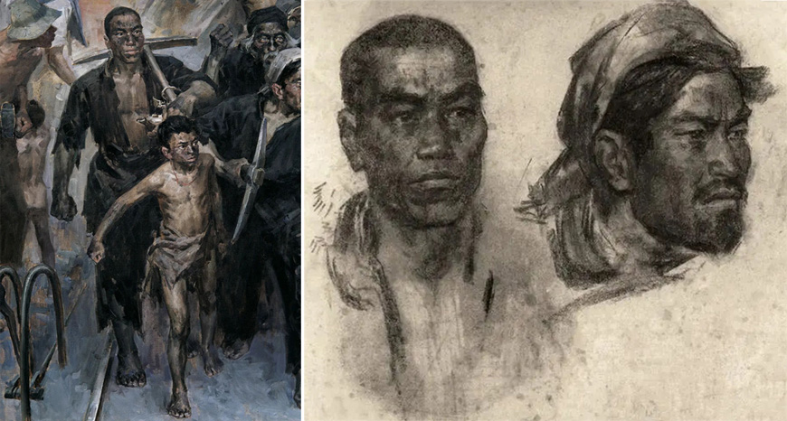 侯一民《刘少奇与安源矿工》 局部及素描稿