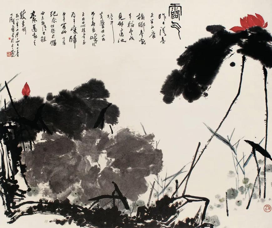 抗战期间在云南时,他自题荷花:“往事不堪重记忆,十年一幅旧荷花”,这在他的慨叹之余应看到他对旧构图的新处理。
