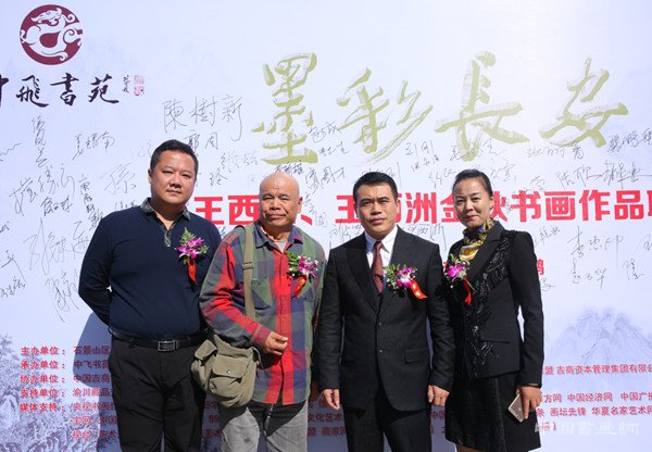 中国书画网张璋报道:2016年10月8日,秋风送爽,丹桂飘香,适逢九九重阳佳节,在这中华民族传统节日到来之际,中飞书苑隆重举办名人名家画展季之“墨彩长安—暨王西京/王西洲金秋书画作品联展” ,此次活动由石景山区文化委员会、中飞书苑、王西洲美术馆联合主办,中国吉商协会、吉商资本管理集团有限公司、西安中国画院、陕西省美术家协会、竹林七贤(北京)文化科技有限公司、中华彭祖文化研究促进会、贵州省茅台镇华成酒业集团有限公司协办,参加此次画展开幕式名家雅士嘉宾有:中联部原副部长于洪君,中国人民革命军事博物馆原馆长郭得河将军,国防大学战略教研部副主任陈有恒将军,原国家新闻出版总署副署长张乐群,中飞书苑院长、中国吉商协会会长彭飞,刘大为精英班画家、西安中国画院艺术部主任王西洲,中国男高音歌唱家、国家一级演员蒋大为,相声演员、主持人、著名书法家赵保乐,著名画家、荣宝斋画院教授马海方,第二炮兵司令部管理局原副局长赵继永,石景山区文化委员会副主任董聪慧,全国政协办公厅服务局副局长赵树庄,全国政协办公厅研究室原副主任梁承宇,原国家画院办公室主任李维平,中央国家机关美术家协会、书法家协会副主席方宇兴,文化部‘文化艺术交流中心主任’盛福春,将军名人名作收藏委员会主任黄齐国,中国国际友谊促进会邓琳,西安政治学院政治委员刘强,人民艺术创作院院长李优良,中国改革报总编王志,著名画家、中国民族美术家协会副主席姜耀南,中国书法家协会会员、著名书法家姚铁力,中国美术家协会河山画会秘书长沉浮,艺术市场杂志社总经理覃婷,贵洲省茅台镇华成酒业集团有限公司董事长彭跃,中飞书苑执行院长李春亮,王西洲美术馆馆长王鹏,陕北公社经理王茂,中华彭祖文化研究促进会顾问陈立柱。