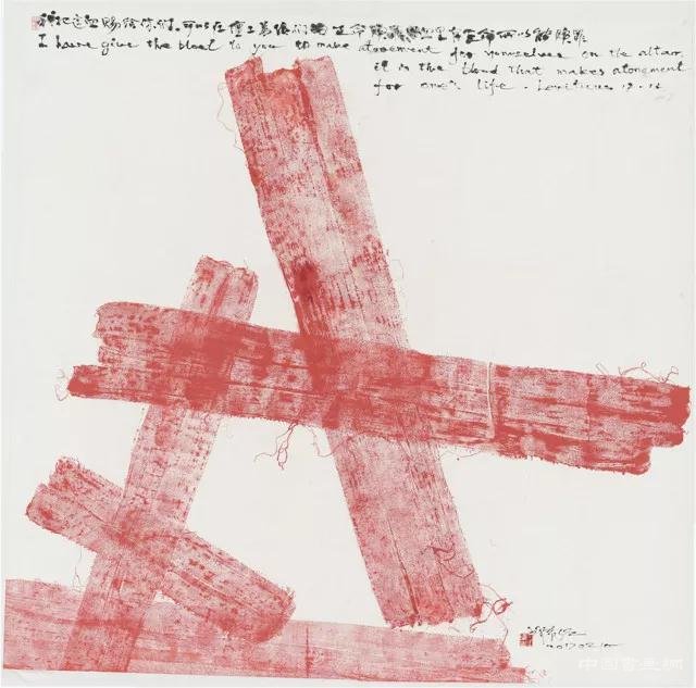 《箴象》系列是我2017年的最新创作,有感于我们所处的当下世界,到处充满着伤害、不安、焦虑、痛苦、动荡等,如难民及引发的一系列问题;战争与准战争,冲突与准冲突;区域与全球、左派与右派、贫穷与疾病、经济与危机等等的问题,我们生存在这样一个动荡不安的地球上。我从新的角度和方式,应用纱布这一有特殊意味的媒材,之前使用它来包扎铁丝网等,这次,我用纱布蘸上红色进行拓印,想表达一种伤害与赎罪的复杂情感。在画面上,还抄录了一些《圣经》关于人类自我反思的箴言。当然,我希望在艺术形式与视觉表达方面有某种新的感觉和冲击力。