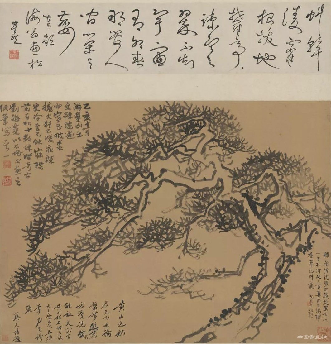 1918年,22岁的刘海粟第一次登上黄山。1920年再上黄山,但这两次并未留存下作品。所以,目前所见刘海粟最早的黄山作品,是这件1935年他第三次登黄山所绘的《古松图》。时乃11月严冬,刘海粟游黄山时遇雨,避雨于文殊院中,久不能寐,便以“不堪书画之纸笔”写院前奇古松树。用笔内敛、迟涩、多变,得古松苍劲之姿。画幅左下有著名教育家蔡元培题跋,盛赞刘海粟过人的笔力。